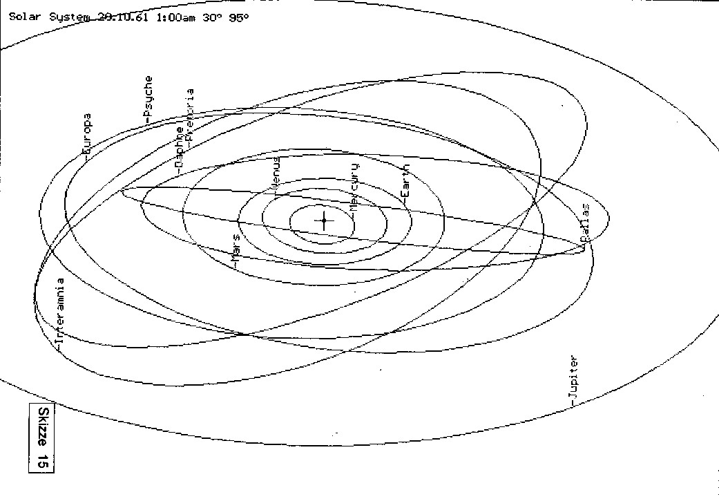 Now it was necessary to use another computer program which displayed especially and in detail the positions of the planets [10]. When Saturn and Jupiter are in the lower right corner in the foreground, it must be viewed from above the ecliptic and between the orbits of Saturn and Uranus looking in the direction towards the inner solar system. While the heavy lines there would be between Saturn and Jupiter, the solid lines would come radially out of Jupiter and connect the inner planets. But which ones? During a first test, Mercury was disturbing with a separate line that wasn't in the pattern of Betty's map. We changed the date a bit and could see how the planets were moving. Now it was clear that we had to choose another date but it should be one in immediate connection to the period of the abduction. We had to go back to Betty's story once again.