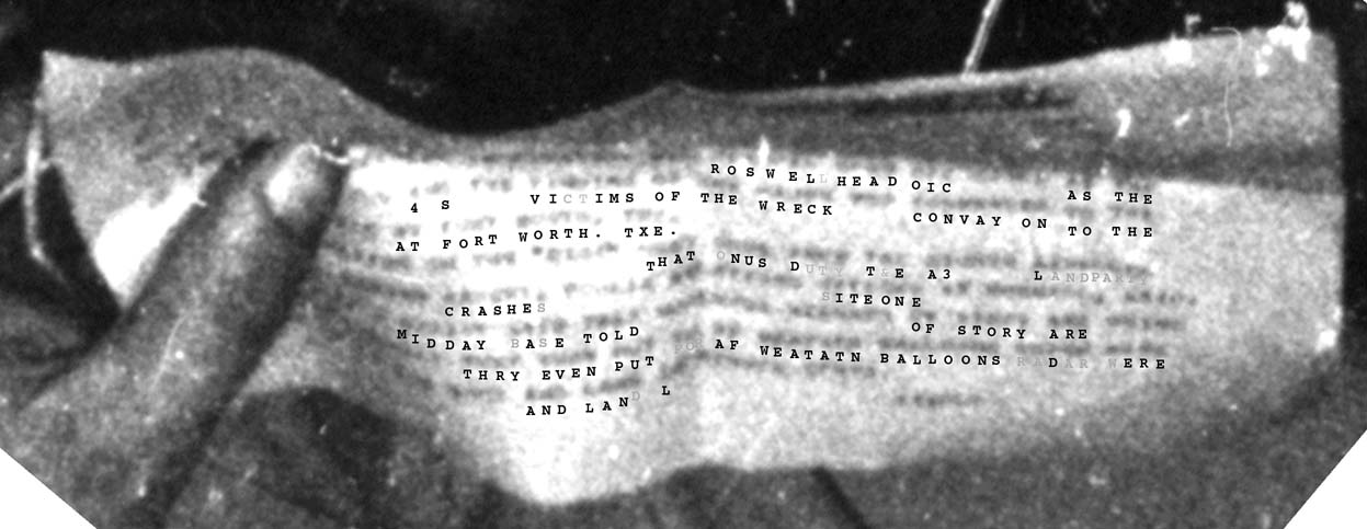 Wieder bewegt sich etwas im Fall Roswell. Der Satelliten-Ingenieur Ron Regehr, der einer MUFON-Sektion vorsitzt, hat auf dem FOX-TV-Sender zusammen mit dem Fotografen James Bond Johnson einige neue Informationen zu altbekannten Aufnahmen vorgestellt. Es geht um die Bilder, die Johnson im Sommer 1947 im Büro von General Roger Ramey von den vermeintlichen Wrackteilen des unidentifizierten Flugobjektes machte. Mit moderner Bildbearbeitungstechnologie ist es laut der neuen Aussagen endlich gelungen, teilweise den Text eines Schriftstücks zu entziffern, das Ramey auf einem der Fotos in seiner Hand hält. Zwar ist der Analyse kein vollständiger Satz zu entnehmen, doch immerhin scheinen die Passagen auf einen interessanten Hintergrund zu deuten. Diese Abschnitte der nun als »Ramey-Botschaft« bekannten Notiz lauten in der Übersetzung: »Da die 4 Stunden die Opfer des welche(s) Sie an das auf Fort Worth, Tex. Die Absturz Geschichte für 0984 erkennt an Noteinsatzkräfte werden an Gebiet Zwei SW von Magdalena, Nmex benötigt Sicherheitsgespräche für die Bedeutung der Geschichte und Mission Wetterballone ausgesandt auf das und landen (Land?) Rovermannschaften unterzeichnet Temple.« Natürlich bleiben die wahren Vorfälle nach wie vor im Dunkeln. Die Botschaft ist viel zu verstümmelt, um etwas Klares daraus entnehmen zu können. Doch scheint sie deutlich zu zeigen, daß damals bemerkenswerte Militäraktionen stattgefunden haben und eine Vertuschung eingeleitet wurde. |